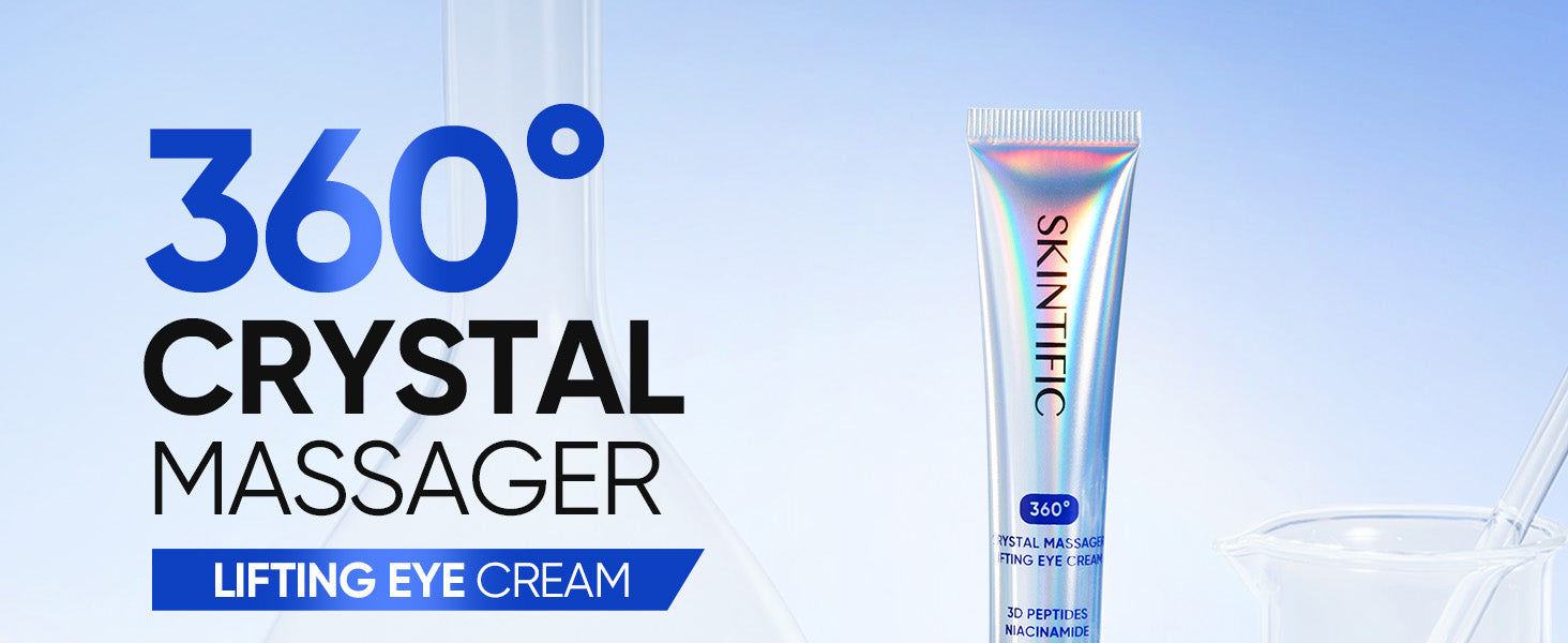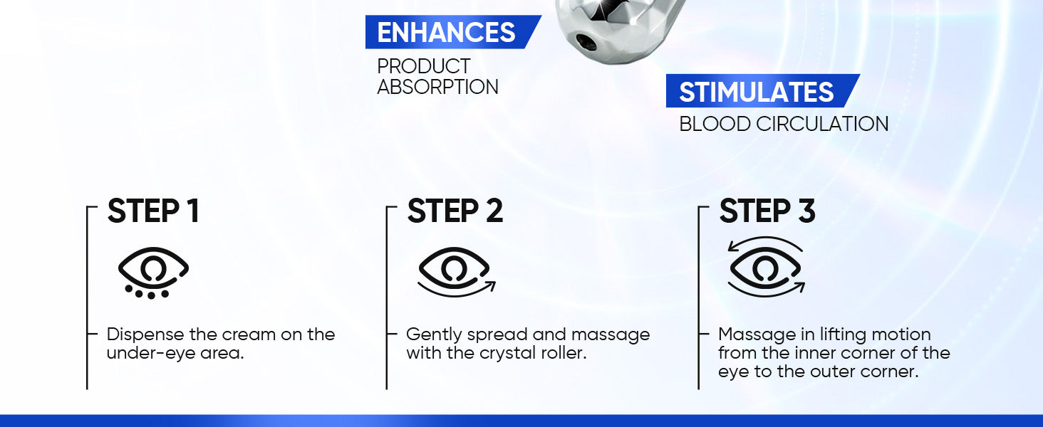 Made with 360० crystal rolling massager from German that have 184 crystal tip and 12,000/ minutes vibration speed up the absorption process to the skin to lift up the skin and reduce dark circle appearance