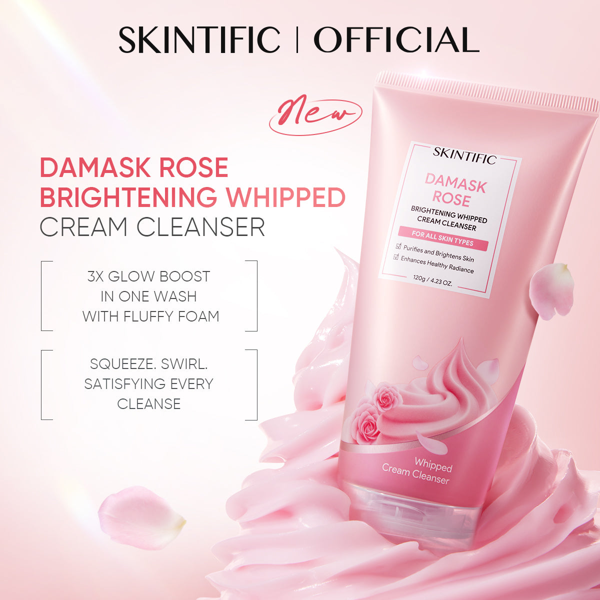 Damask Rose Brightening Whipped Cream Cleanser is a brightening whipped foam cleanser designed to turn daily cleansing into a soft, comforting skincare ritual. Its ultra-soft whipped cream texture transforms into a cloud-like foam cleanser that cushions the skin while gently lifting away makeup, excess oil, sunscreen, and daily impurities.