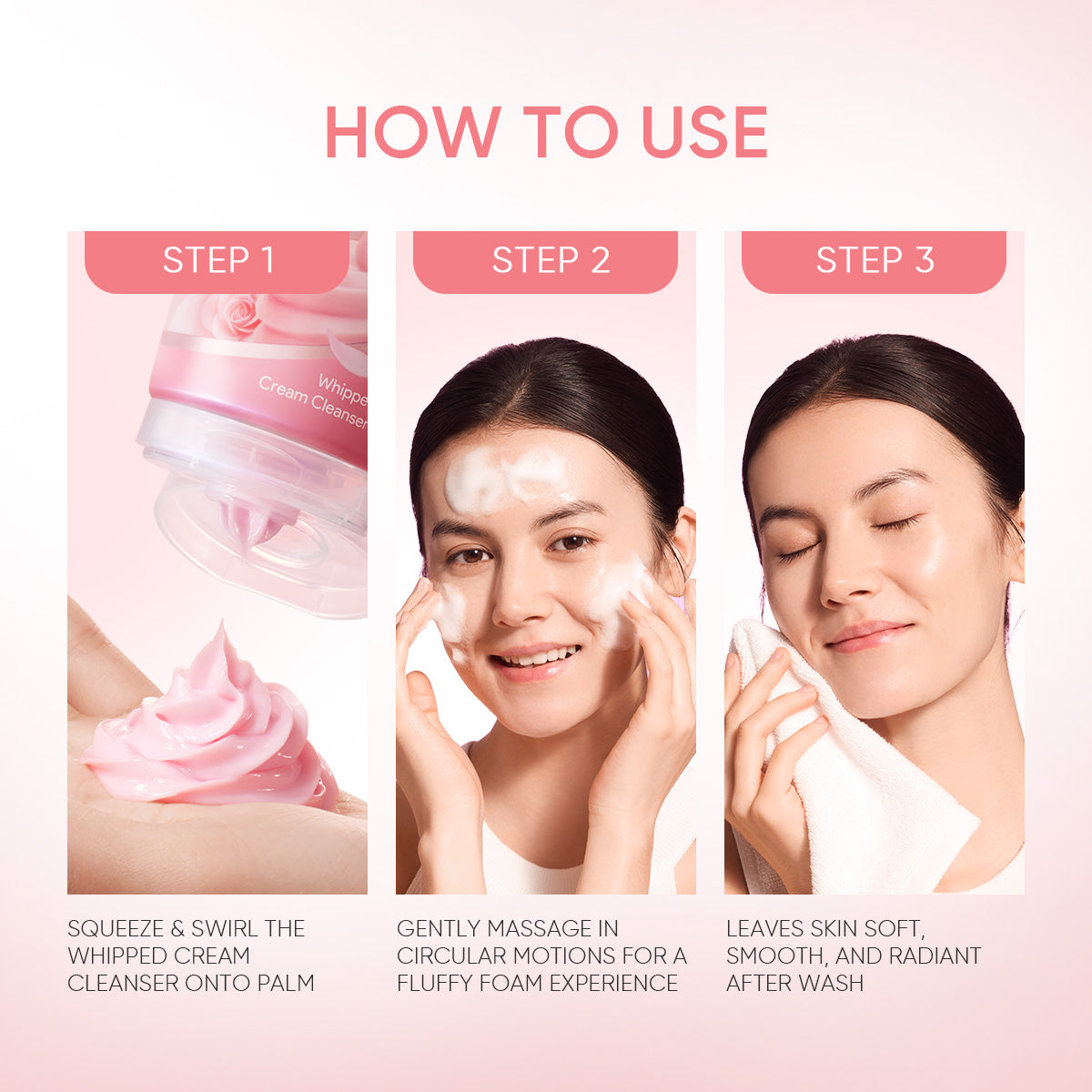 - Texture: Whipped cream foam cleanser